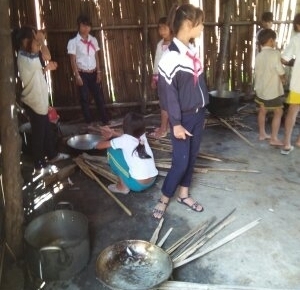 Học sinh Trường THCS Sơn Liên tham gia nấu ăn theo hướng dẫn của giáo viên